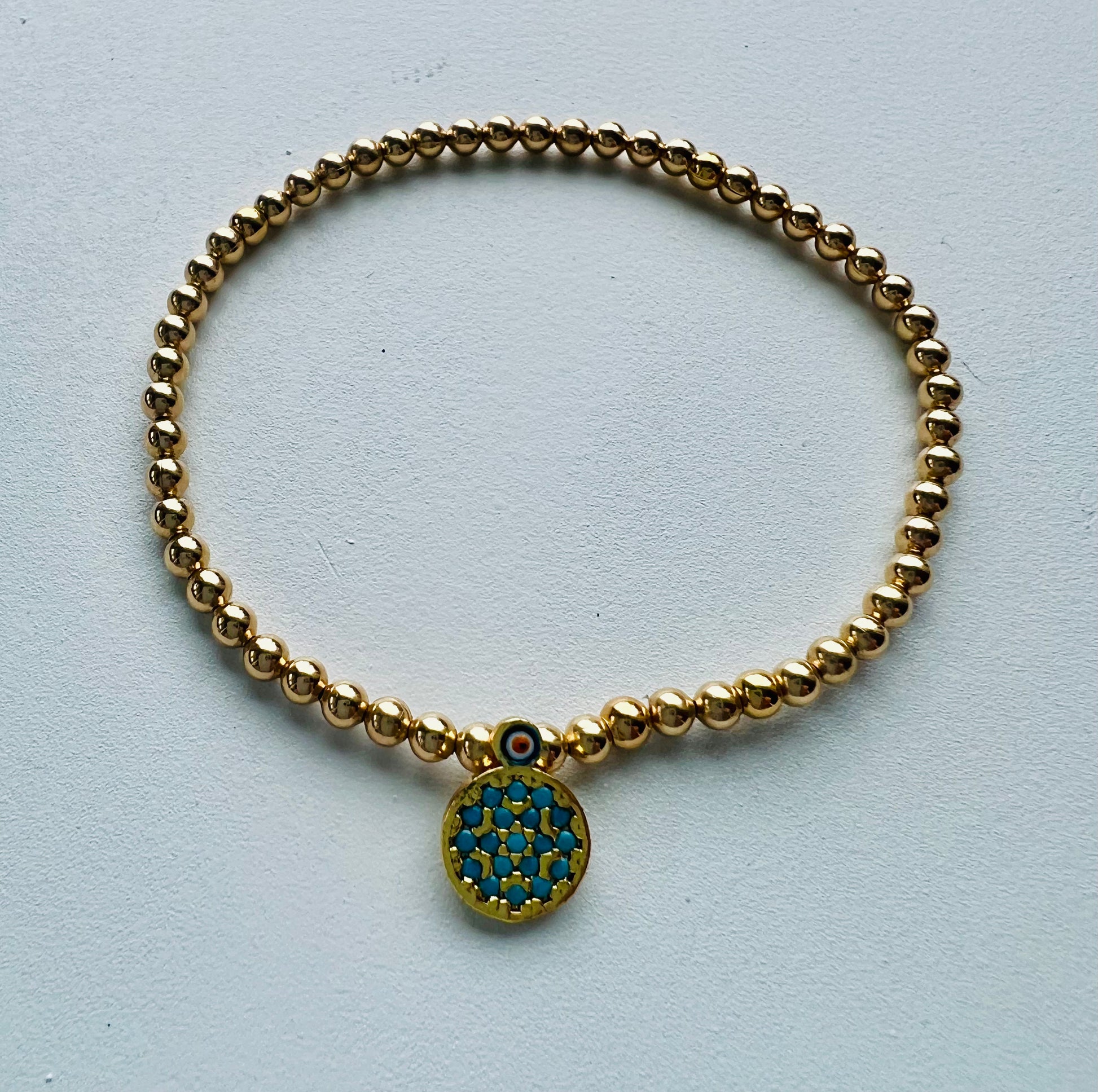 3mm gold filled beads paired with a striking turquoise evil eye which is known to ward off evil and protect.