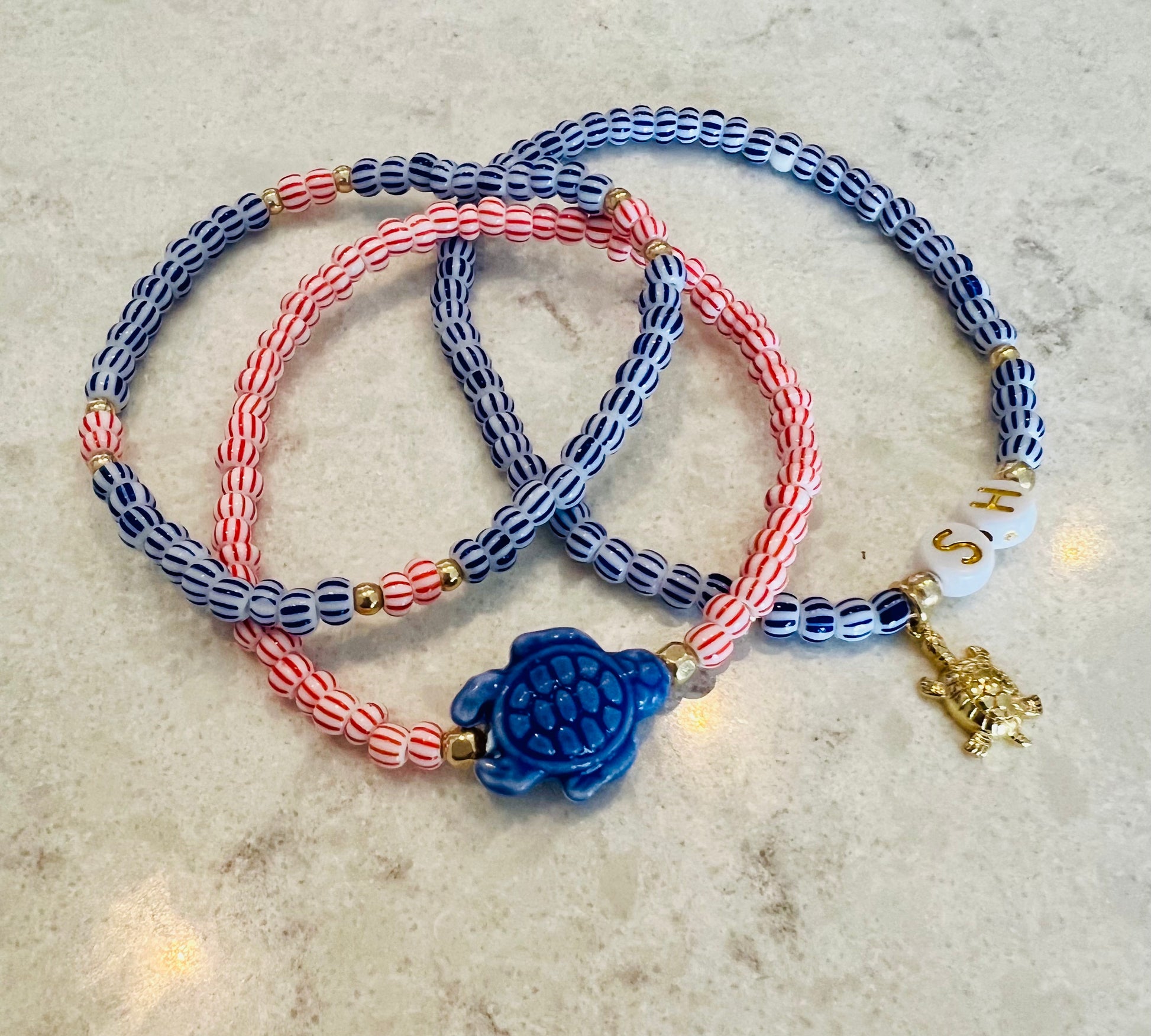 Introducing our vibrant and charming NJ shore coastal beaded bracelets. Each bracelet features intricately designed beads in complementary shades of blue and red, accented with 14k gold-filled beads. Wear them stacked or individually to express your unique style and personality.