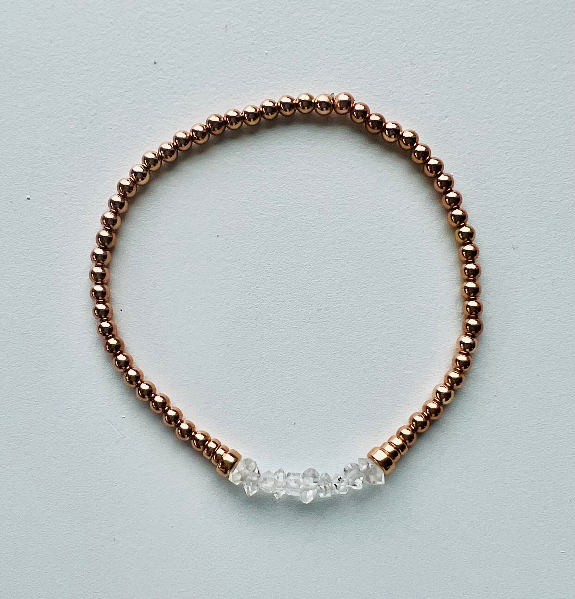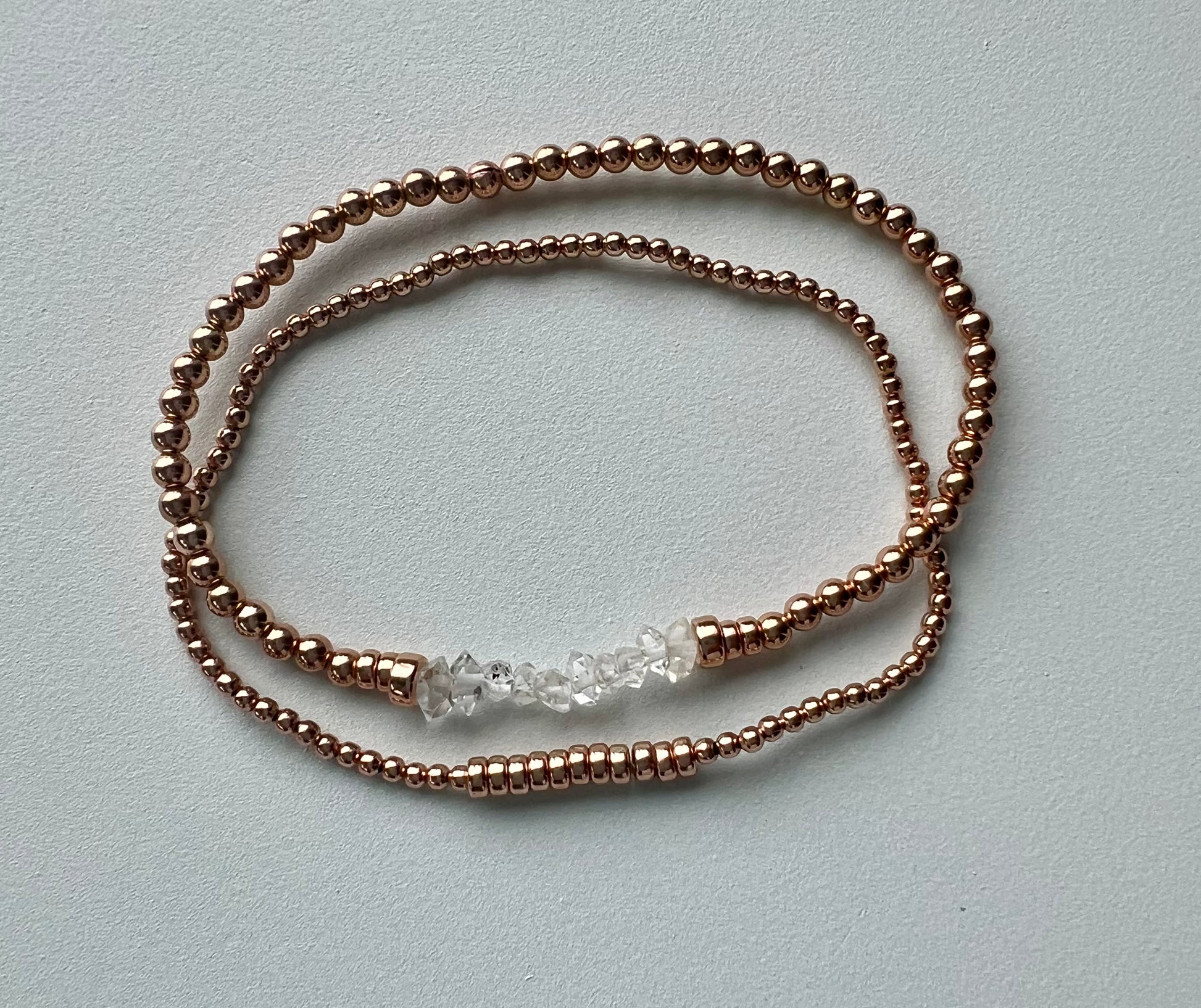 Herkimer diamonds paired with rose-gold filled beads strung in string elastic.