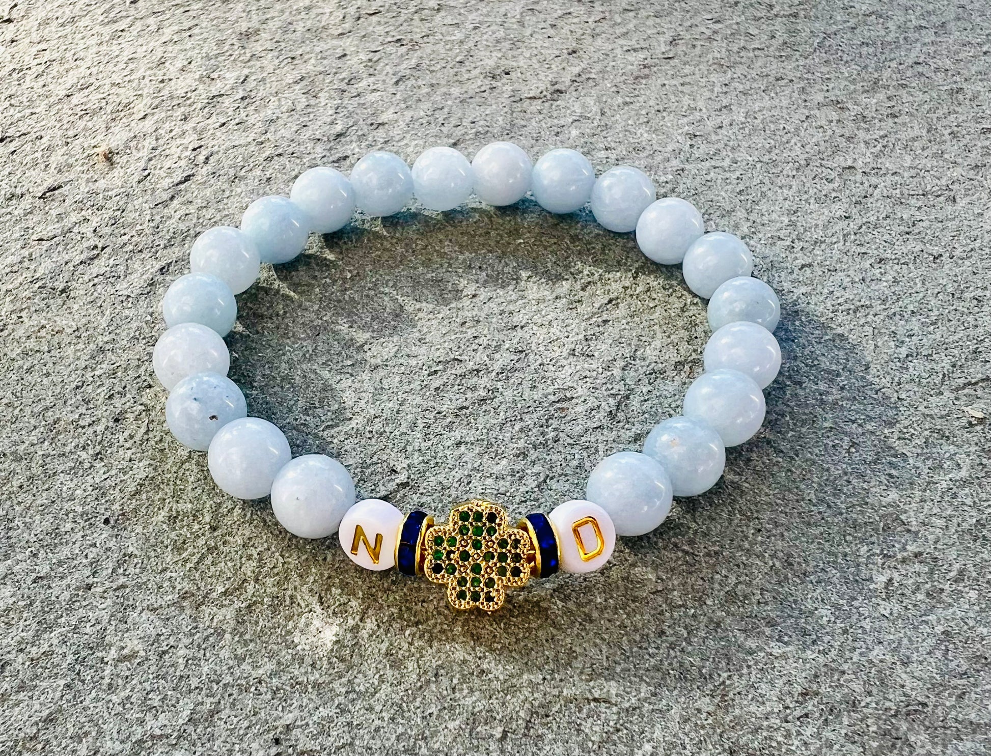 Show your Irish spirit with our custom made NDHS stretch bracelets! made with strong stretch elastic, blue lapis or aquamarine stones, a pave green and gold shamrock , and your choice of either green or blue accent stones. Our bracelets are made to fit a standard 6.5' wrist. Please let us know if you require a size adjustment.