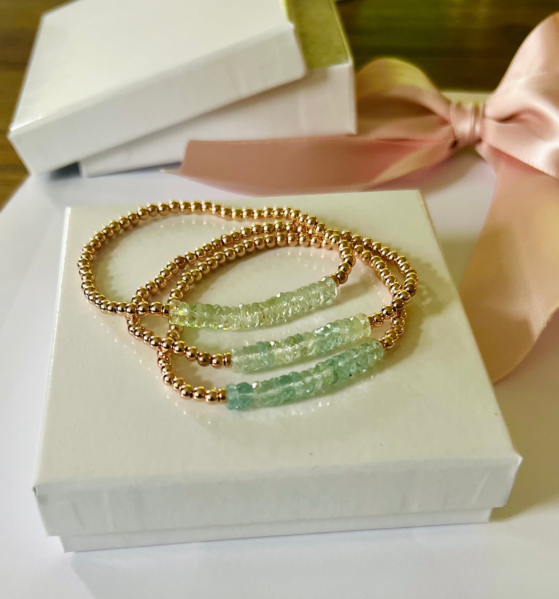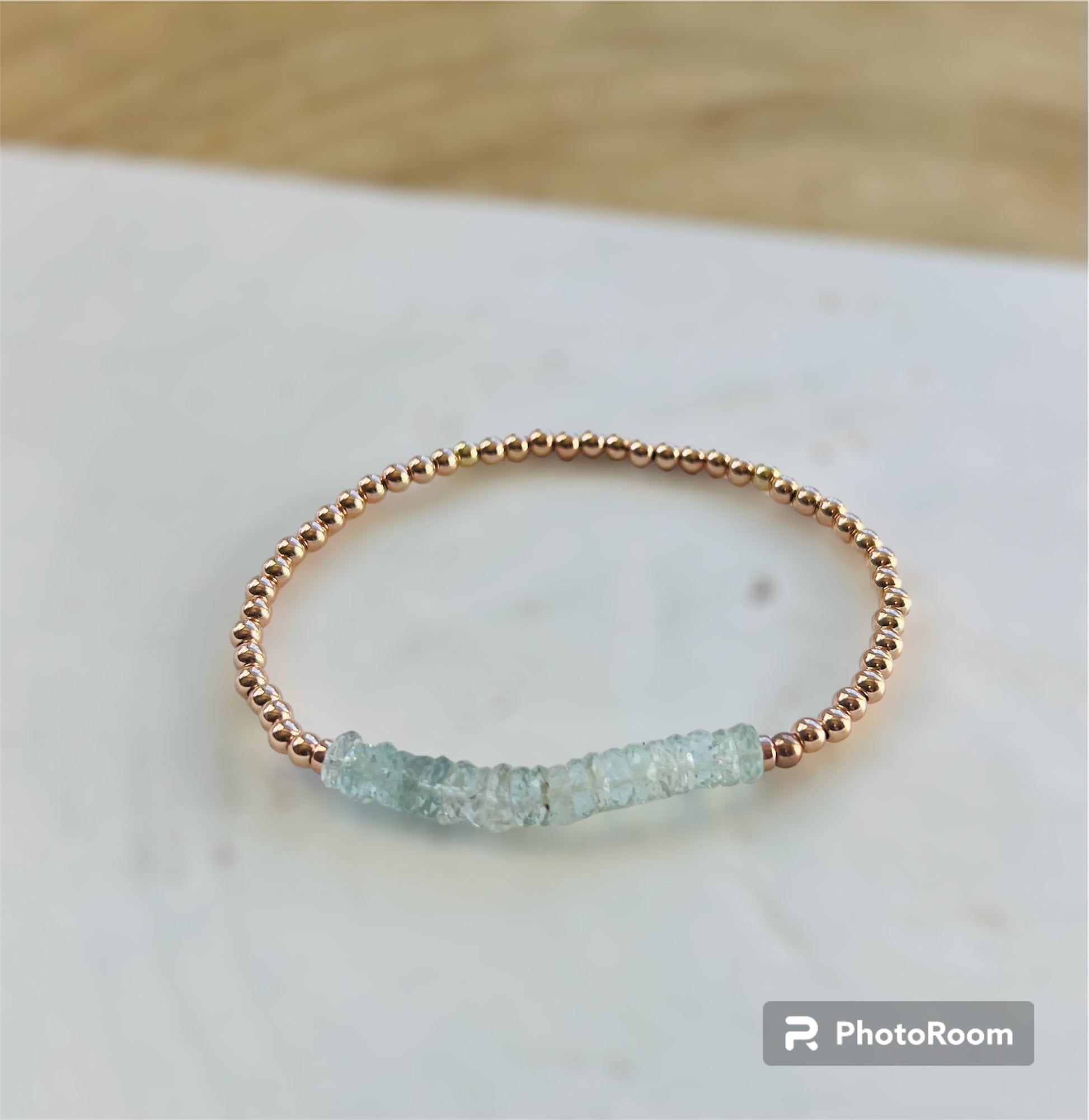 The Lafayette Bracelet with gorgeous Aqua Marine Stones and 4mm gold filled beads. Available in Rose Gold Filled or 14K Gold Filled. This stretch bracelet is stunning alone or as an addition to your stack.