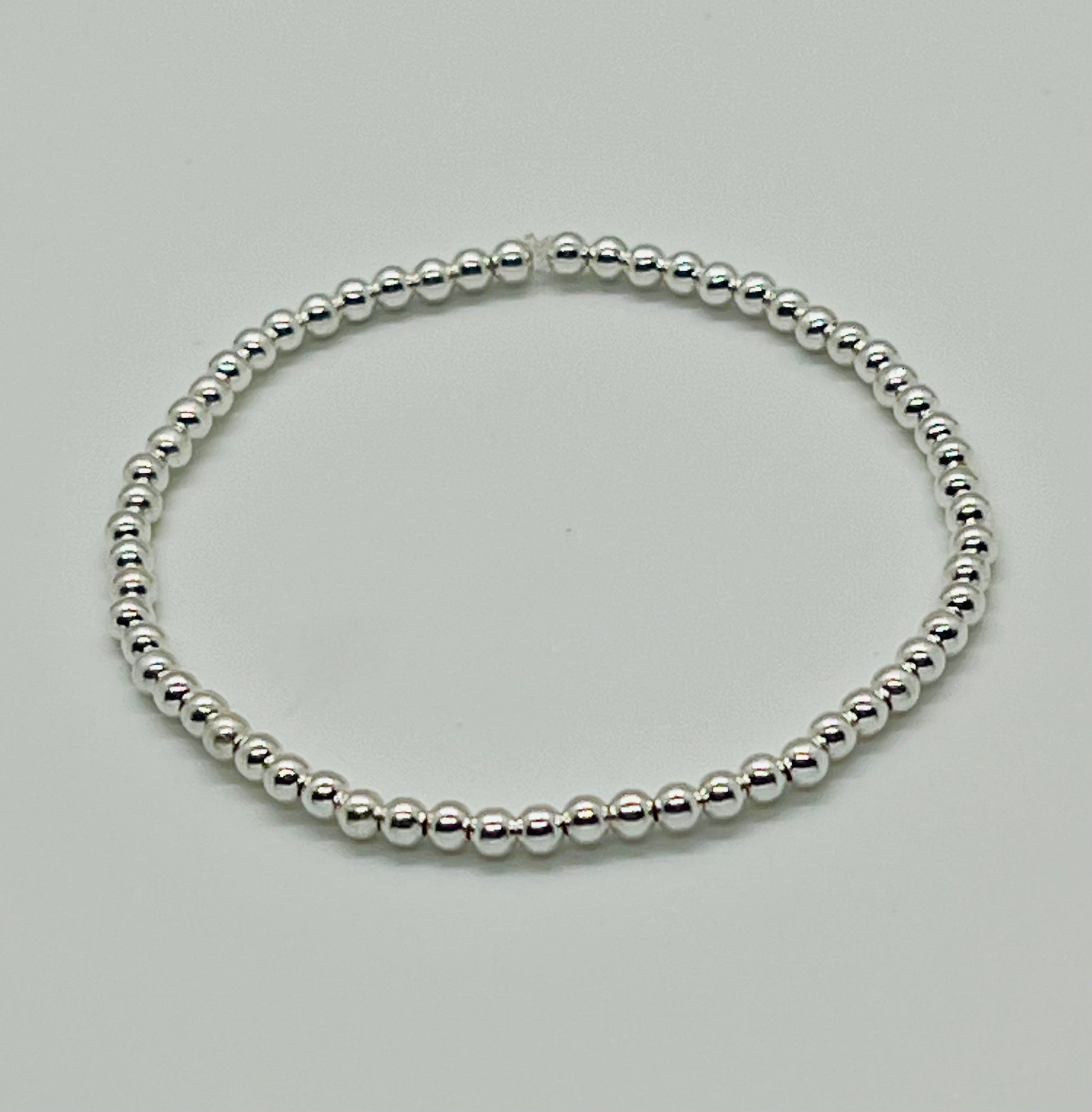This Liberty Bracelet is made from sterling silver beads strung on strong elastic. Available in 3mm and 4mm.